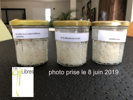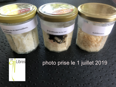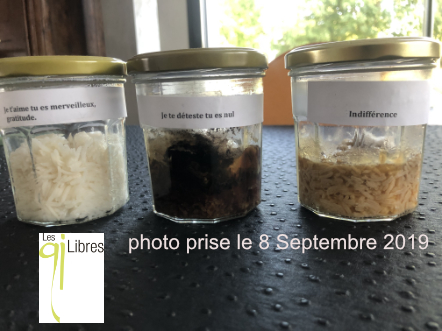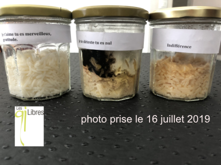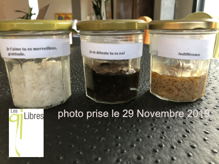 Modalité : vous prenez trois contenants identiques (préparés dans les mêmes conditions) dans lesquels vous y déposez la même quantité de riz (provenant d’une seule et même cuisson). Sur chacun des pots noter l’une de ces trois notions : Indifférence / je te déteste tu es nul / je t’aime tu es merveilleux, gratitude.